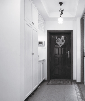 由于玄关的流动量大,选择的地面材料要耐用、便于清洁。铺贴地砖是较佳选择,但需要根据铺贴空间决定地砖种类,抛光砖,防滑砖,亚光砖,大理石瓷砖等都有其独特之处。玄关处瓷砖可以选择与客厅同一质感但颜色较深、图案更复杂的款式,或者选择拼花造型。需要注意的是,因地砖比地板厚,为了铺好之后齐平,需要在铺地砖的部分刨下一层地面,然后再找平。如果嫌脚感不好,可以在上面加一块地毯,同时也能提升玄关的格调。至于墙面,如果室内空间大,可将玄关做成全隔断或半隔断,为墙面进行一些手绘创作,使人感觉时尚个性;如果面积较小,墙面则不宜做太多造型,起一定的点缀作用即可。