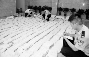 10月14日,景德镇市公安局经侦支队的民警在清理缴获的假发票。新华社发