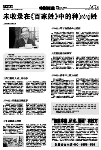 家住项城市丁集在外跑运输的小种说:“我接触的人比较多,每次给他们介绍我姓种,他们都说我是自己造的姓,我虽然哭笑不得,但是每次仍会给他们解释我的姓氏。我想通过这样的方法让更多的人了解我们种姓。”