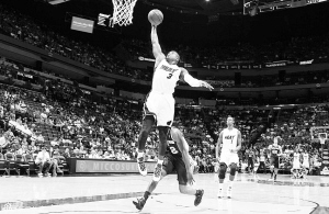 热火队当家球星韦德(上)在比赛中扣篮