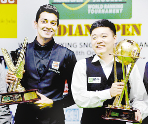 中国选手丁俊晖(右)与印度选手麦赫塔在颁奖仪式上