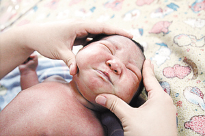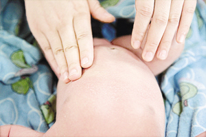 为宝宝抚摩,抚摩方向要十分讲究。大人的手要从宝宝的头抚摩到躯体,然后从躯体向外抚摩到四肢。这种手法与一般的成人按摩正好相反。“动作是抚摩或轻柔的捏。捏的时候要轻,以免伤害宝宝娇嫩的血管。捏一下,手指要滑动一下,然后再捏一下。”
