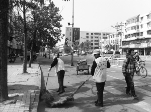 李发成、胡延兰结伴清扫路面