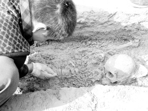 这座墓葬为南北向竖穴土坑墓,墓葬开口于第3层,开口距地表3.5米,墓底距地表4.0米,深0.5米。墓葬土圹南北长2.4米,宽1.1~1.2米。内葬一人,头向北,面向东,葬式仰身直肢,女性,年龄约40~50岁。在挖掘过程中,令文物勘探人员意想不到的是在该墓葬的西南部发现一儿童墓葬,南北长约1.3米,宽0.45米,内墓一人,从出土的乳牙分析,儿童的年龄约为5~6岁。