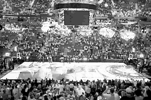 近20000名观众提前一小时涌入美航中心球馆,一睹NBA历史上最奢华的总冠军颁奖仪式。世界上最先进的3D投影技术,将比赛地板变成一个硕大的屏幕,众人挥舞荧光棒,低头俯视,回顾热浪的夺冠历程。上赛季一度走红的“哈林摇”舞蹈,也在视频中重现,那是热浪在比赛之余更衣室的余兴节目,亦是如此鼓舞人心。