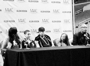 本报综合消息 北京时间10月31日,NBA传奇球星阿伦·艾弗森在费城举行新闻发布会,正式宣布退役。至此结束自己精彩的篮球生涯。在发布会上,艾弗森带着一家老小,共同见证自己的谢幕。