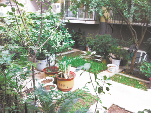 记者看到,一座拱形大门加上铁艺栅栏把小院围得严严实实,门前桃树枝繁叶茂,寓意桃李盈门;铁栅栏和拱形门被葡萄架、爬墙虎包围,犹如绿色屏障,显得绿意盎然(如图一)。透过绿色屏障再看小院,不足20平方米的小院子显然是经过一番精心布置:走廊利用广场砖硬化,显得更加整洁;小院右侧,原有的土地按方格布局,利用混凝土硬化通道,露出6块菜畦,分别种植着蒜苗、香菜、韭菜等,菜畦间的硬化通道上又摆上铁树、万年青、月季、广玉兰等十多个盆景,消除了菜畦的单调,使小院更显郁郁葱葱。还有,菜畦里的一棵石榴树,虽然石榴被摘完了,那坚守的绿叶仍不忘给深秋的小院增添一份绿色(如图二)。
