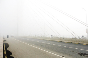 昨晨,大雾弥漫,市区道路能见度不高,直至上午10时,大雾才逐渐散去。晚报记者 郭坤 摄