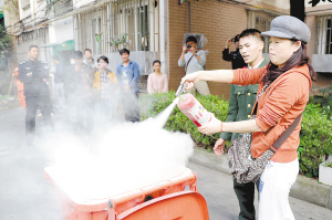 11月6日,在杭州市西溪街道,一位社区工作人员在消防战士的指导下使用灭火器。