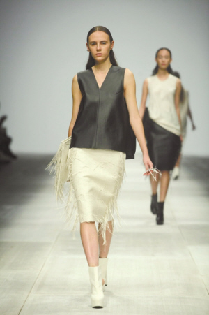 有着文艺青年范儿的独立设计师邱昊一向不喜欢被问设计灵感,他更愿意让观者自己去品味他的服装里传达出来的意味,而设计,只遵守“听从内心”这一原则。这一季,依然是干净明了的黑、白、红、银几个色调,极简的线条、立体的剪裁,穿插着重磅真丝面料、手工羊皮编织工艺以及贝壳吊饰等细节,制造出一种繁与简、质感与轻盈、时尚与复古的冲击感。