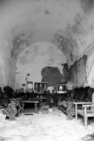 冒着秋雨,我们行走于址坊镇通往南流村的乡间小路上,远处模糊的村庄逐渐清晰起来。通过观察,我们发现南流村的民房和其他村庄的并无两样。但走进村民王红军家,首先映入我们眼帘的是一字排列的3间呈窑洞样式的房屋。从外形看,这3间房屋比平常房屋要高一些,房屋外顶呈三角形,屋顶上乌色的瓦片,印着斑驳的记忆。因为是雨天,屋内亮起了灯,昏黄灯影里的白色拱形屋顶,凝重而安详。这3间房屋使用的砖块要大于现在盖房使用的砖块,那是手制的泥胚砖,厚3寸、宽6寸、长9寸。“从1975年8月房子建成到现在,30多年了,基本没整修过,也没漏过雨。最主要的是这个房子住着冬暖夏凉。”王红军说。