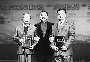 本报综合消息 中国曲艺家协会主席姜昆11月6日现身江苏曲艺“芦花奖”颁奖晚会,为获得终身成就奖的苏州弹词表演艺术家金丽生、邢晏春颁奖。