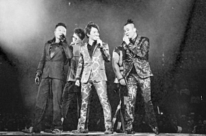 最让人振奋的一个场景,即陈小春身着黑色毛皮大披风出现在舞台上,以一首《献世》安慰情景剧中因女主角离开备受打击的郑伊健,随后大合唱的《热血燃烧》、《友情岁月》再现了山鸡陈浩南的兄弟情谊,几度引发沸腾。