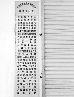 对于这些林林总总的牌子,南宁市明秀北社区主任邱成认为,这恰好反映了社区工作者的任务繁重。明秀北社区负责具体工作的只有11个工作人员,却要分管6000多位居民,其中还有400多个流动人口。“我们标牌上虽然有这么多职能部门的名字,但那并不代表一个部门,只是表示职能的工作内容,让群众看到牌子就知道我们都负责什么工作。”