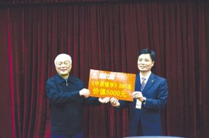 河南省孔子学会周口分会成立大会暨学术研讨会上,生命人寿周口中支总经理褚立波(右)当选为孔子学会周口分会常务理事,并在成立大会上代表生命人寿公司向河南省孔子学会现场捐赠《中原儒学》500本。张峰 摄