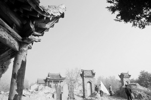 就像其他古迹一样,曾经金碧辉煌的烟雾山古建筑早已被岁月的风沙不留痕迹地吞噬了。我们如今能看到的,除了一块“桐丘故城”的水泥牌子能说明这里是市文物保护单位外,就是遗址上近几十年来陆续复建的庙宇。放眼望去,虽说也是雕梁画栋,飞檐斗拱,但红砖新瓦给人的感觉少了一份厚重。