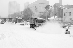 11月17日,在哈尔滨市道外区,几台清雪机在进行清雪作业。新华社发
