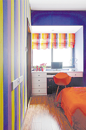 将窗户延展为写字台,制造出室内飘窗的感觉。窗帘以由暖而冷的渐变色彩打造,犹如挂在窗口的一道彩虹,增添跳跃感。