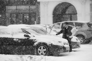11月19日,长春市民在出行前清理覆满车身的积雪。