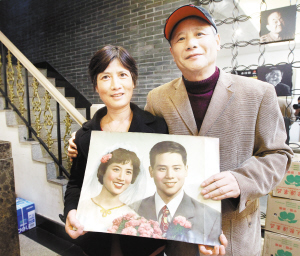 11月20日,在人民照相馆预约拍摄婚纱照的曾先生和妻子向记者展示他们1979年拍摄的婚纱照。
