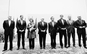 11月24日,在瑞士日内瓦,欧盟外交和安全政策高级代表阿什顿(左三)宣读联合声明。