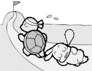 时间过得真快,转眼间比赛时间到了。这一天,天空万里无云,一大早,动物们都到齐了,它们纷纷排好队站在两边,只等裁判员小猴发令了。这时,小猴不紧不慢地走过来说:“预——备!”只见兔子和乌龟都做好了准备跑的姿势。“开始!”听到号令,乌龟和兔子都像箭一样冲出去,兔子跑了一会儿觉得很奇怪,乌龟今天怎么跑这么快呢?忽然,兔子耳边响起“哧哧”的声音,它扭头一看,原来是小乌龟飞快地追上来了。兔子惊奇地睁大眼睛一看,乌龟脚下有4个滑轮,兔子刚一眨眼,乌龟已经跑出一大截了。兔子这次不想输掉,它拼命地往前跑,累得大汗淋淋。终于到达终点了,但乌龟早已坐在那里了。原来乌龟身上装了一个推动器,怪不得跑这么快。