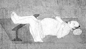 后来,唐朝的陆曜绘有《六逸图》,其中的“边韶昼眠”图,画的就是边韶老师“昼寝”之事。画中,几近赤裸的边韶老师躺在竹席上,双手抓书简于胸前,头枕在一捆书籍上,脚跷在一张隐几上,睡得非常香甜。