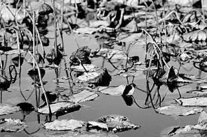 “留得残荷听雨声”的诗句,把我引到了荷池边,想看看冬雨中的荷,真如诗中写的那样凄凉哀怨吗?驻足河边,放眼望去,满目的残荷,荷叶的枝杆干枯了,有的折断垂首;有的光杆傲立;有的叶面焦黄;有的布满洞孔;有的散落于水面,漂浮其间。雾气中更显一份悲沧。