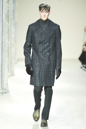 典型的男士大衣有两种类型:Top Coat 和Over Coat。一般来说,Top Coat长度在膝上,质地较薄,适合春秋季。而Over Coat 则是冬季穿正装男士的必备品,穿于西服和晚礼服外面。长度过膝(长度为至膝下15-20cm为佳),多为羊毛材质,廓型呈现茧型。