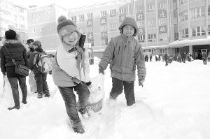 当日,受11月25日暴雪影响停课2天的黑龙江省牡丹江市中小学生恢复上课,许多学校及时清理打扫校园积雪,以保证学生安全。新华社发