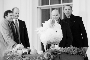 当日,美国总统奥巴马在白宫举行一年一度的感恩节火鸡赦免仪式,一只名叫“爆米花”的火鸡连同它的同伴,一只名叫“焦糖”的火鸡,一道获得了当年的总统感恩节“特赦”。新华社发