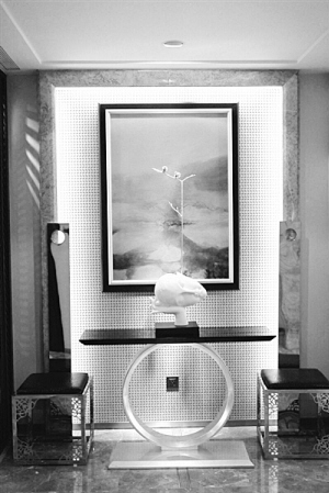 金色的墙面衬托白瓷的工艺花瓶,素雅的油画作品搭配其后,与金色圆弧造型的玄关柜搭配,清新而有格调。点缀也不必太多,桌面、墙上,有一两处即可。