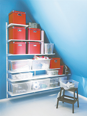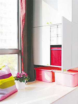 内阳台的一角,摆上一组多功能搁架,就成了一个简易储藏室。平时不大用到的工具、一些小型运动器械,还有主妇们储备的米、面等食物都可以分类储放在这里。配合外挂式搁架和各种尺寸的储物盒,可以使储藏角更井井有条。
