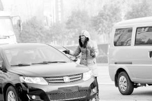 在周口大道与平安路交叉口,散发广告传单的小杜围着围巾,冻得满脸通红,趁着绿灯亮起,车辆通行时,她赶紧闪到路边跺跺脚。