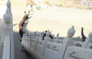 远远望去,大悲寺像沉睡中的巨人,矗立在群山怀抱之间。这里更像是一个综合开发工地,远远望去,到处都是建设的场面。铁栅栏围起数十米,上挂醒目牌子:“修行道场,禁止旅游,禁止拍照”等字样。