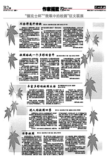 校园里有迷人的四季:色彩斑斓的春天,枝繁叶茂的夏天,枫红菊香的秋天和白雪皑皑的冬天。