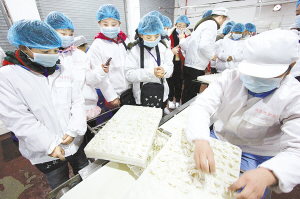 在产品展示大厅,听过一级营养师魏长民的讲解后,小记者分两批参观生产车间。工作人员要求,进入车间之前,必须穿上白色的工作服,穿上专用鞋,还得戴上口罩,最后全身消毒,才能进去。小记者全副武装后过了消毒关,随工作人员走进车间。