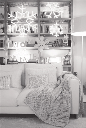 看惯了浓烈的红绿圣诞装饰,白色圣诞气氛也很是清纯浪漫。温暖的原白色布艺沙发搭配浅色花纹的小抱枕,大大小小的雪花灯饰营造了一个浪漫的雪夜圣诞节。
