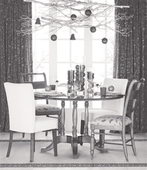 在餐厅布置中,几块以红色为底色的布艺窗帘立刻营造出了简单而又浓烈的圣诞气氛。屋顶的吊饰也标新立异,垂挂下来的树枝和彩球使得整个空间灵动俏皮。