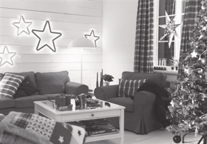 装饰方法:简洁而又有暖色光感的小灯饰是装饰的利器。墙壁上悬挂几个大大小小的星星灯,或者用圣诞字母拼成的灯饰,雪花形状或者可爱的圣诞老人头像等,都可以瞬间点亮节日客厅。