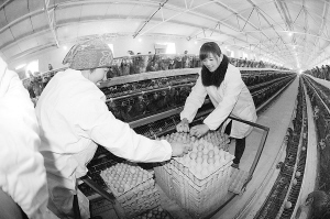“喂养是全机械化的,喂养机器开动后,鸡架上的2万多只母鸡可以在不到1分钟的时间内全部吃到食物。”其中一位饲养员告诉我们,“喂的主要是玉米。”