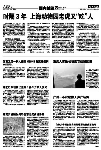 本报综合消息 12月17日上午,上海动物园再次发生老虎咬死饲养员事件,工作了30多年的周师傅在打扫笼舍时遭到他日常喂养的一头9岁雄性华南虎袭击。待他的同事发觉时,周师傅已经没有了生命的迹象。记者了解到,肇事华南虎虽然从小生活在动物园内,但野性依然很强。这是继2010年3月以来,上海动物园发生的又一起老虎伤人致死事件。动物园17日表示,不会对肇事华南虎实施安乐死。