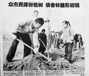 “我清楚地记得植树那天是2004年3月13日,我和妻子带着12岁的女儿、8岁的儿子,拿着工具早早就来到广场。”王俊祥说,“当时来种树的人很多,他们或是三五成群、或是拖家带口,约三四百人。领树苗期间,我还听到一些市民与工作人员商量,他们能不能现场报名植树。”
