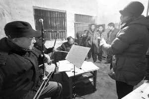掀开门帘,只见3名佩戴老花镜的男子端坐桌前,各自手持一把二胡,安然伴奏,一丝不苟。旁边,一名头戴红帽、身穿棉袄的中年妇女,手持梆子,倾情唱着豫剧《朝阳沟》选段。此情、此景,煞是温馨。