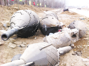 “穿越工程”钻孔完成后,接下来就是安装输水管道。喻金钟介绍,输水管道是用内径1米的钢管焊接而成,钢管焊接完成后,把钢管的一端在“穿越工程”的终点与定向钻钻杆相连,然后由定向钻机拉着钢管管道向“穿越工程”的起点一点一点地回拖牵引,最终达到“穿越工程”的起点,管道安装完成。