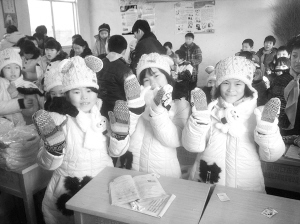12月28日,团市委联合市公安局为西华县后套希望小学的学生送去了羽绒服、围巾等防寒物品。图为该校学生王雨婷、王淑婧、王璐萍面对记者的镜头,展示她们的新衣服、帽子、手套、围巾。晚报记者 张燕 摄