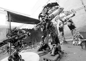 近日,记者与用废铁做机器人的80后小伙儿明超取得了联系。来到他们做机器人的地方,一进门就看到一个约2米高的“大黄蜂”站在院内,它的身后还有“铁皮”和“擎天柱”。“这些‘变形金刚’是我们刚做好的。”明超说,其中擎天柱是最大的,高约3.2米,重量近一吨,是他们用废弃的汽车、摩托车零件和废铁料,历时一个多月刚完成的。除了这些大型的机器人,他和两个朋友石冬、李向阳还分别做了一些小型的工艺品。