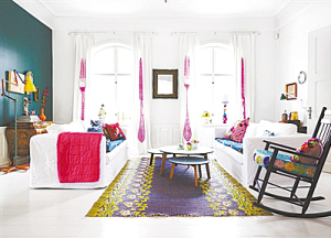 除了一面背景墙采用墨绿色,其余全为白色打底。窗帘上的刀叉图案格外清晰,蓝、紫、玫红组成的靠包、坐垫看似杂乱,却将居室点缀为写意空间。