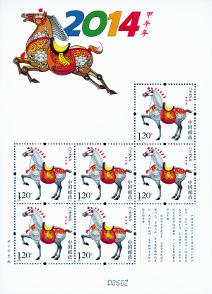 据了解,此次发行的《甲午年》特种邮票1套1枚,面值1.20元,是我国发行的第三轮生肖邮票。将于2014年1月5日发行的《甲午年》生肖邮票主图是一匹充满喜庆富贵色彩的马。该邮票由我国著名平面设计师陈绍华先生创作,在设计上汲取了我国古代马雕塑的精髓,并参考唐三彩马的特征,运用富含吉祥寓意的传统装饰图案,表现出了马的俊朗、强健与吉祥。白马面颊俊秀、筋骨雄强、体态优雅、气宇轩昂,装饰在马身上的牡丹、蝙蝠,表达了“马上得福”、“吉祥富贵”的美好祝愿。