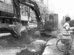 2014年1月2日下午,记者在施工现场看到,维修工人正在紧张地铺设管道,挖掘机也在忙碌地对安装好的管道进行填埋、夯实(如图)。该负责人介绍,东新区庆丰路(周口大道至中原路段)和府苑路(庆丰路至文昌路段)两条道路上的供水管道自通水后,管道爆管现象频繁发生,截至目前,该公司已对两条道路上的供水管道维修了30多次,严重影响了该区居民的正常用水。为彻底改变这一现状,保证居民春节期间正常用水,该公司近期投资100多万元对庆丰路、府苑路相关路段自来水管道全部进行更换。